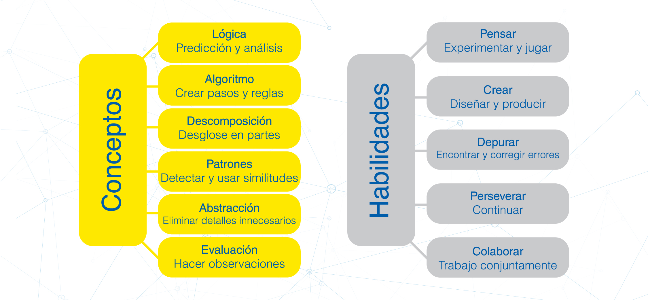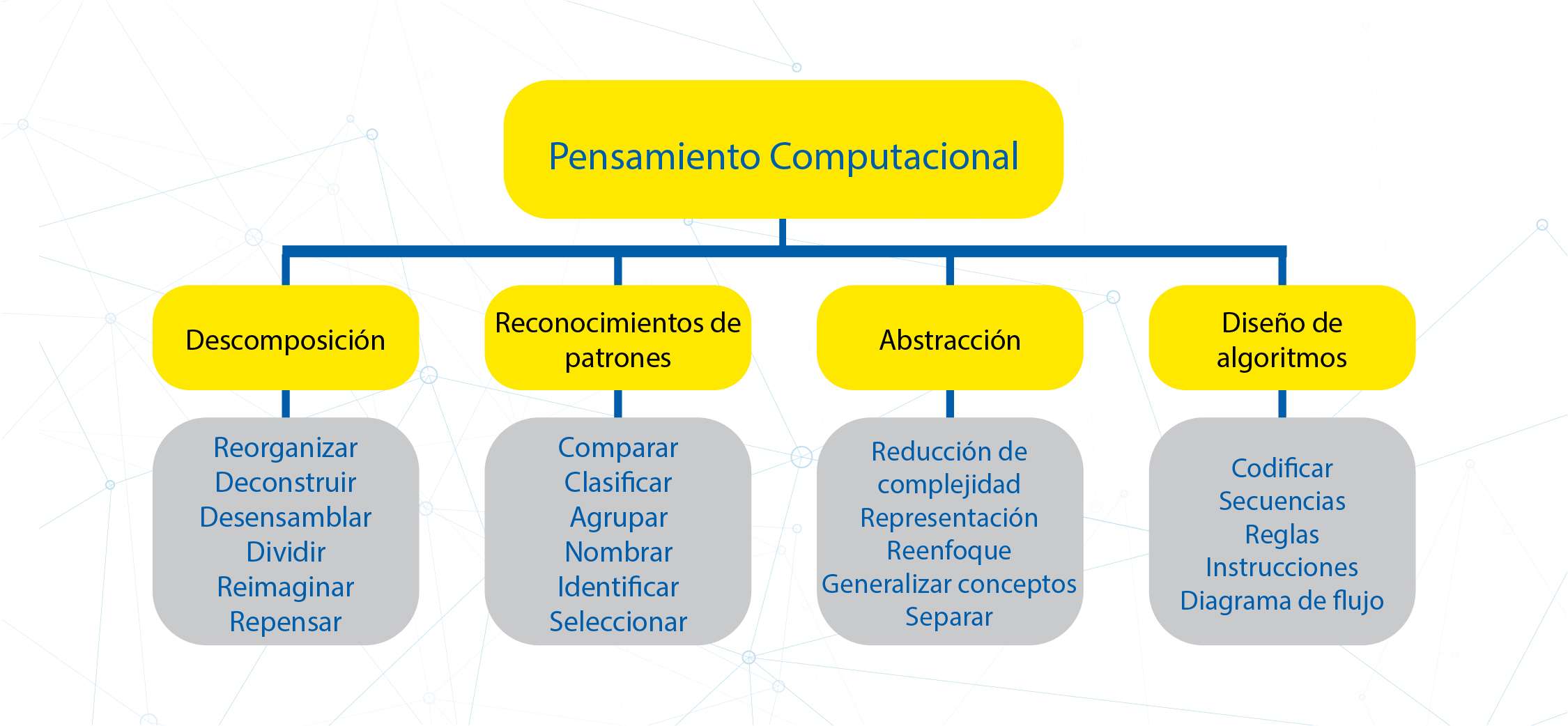 De todos estos conceptos, resaltan cuatro que se consideran los pilares del pensamiento computacional: la descomposición de problemas, el reconocimiento de patrones, la abstracción y el diseño de algoritmos.