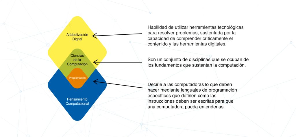 Aunque el pensamiento computacional comparte las mismas habilidades que las ciencias de la computación y tiene relación con otros dominios de la computación, este no trata ni de aprender a usar la computadora ni sobre programación de computadoras, aunque por supuesto, explorar y crear programas de computadoras es una de muchas herramientas para desarrollarlo.